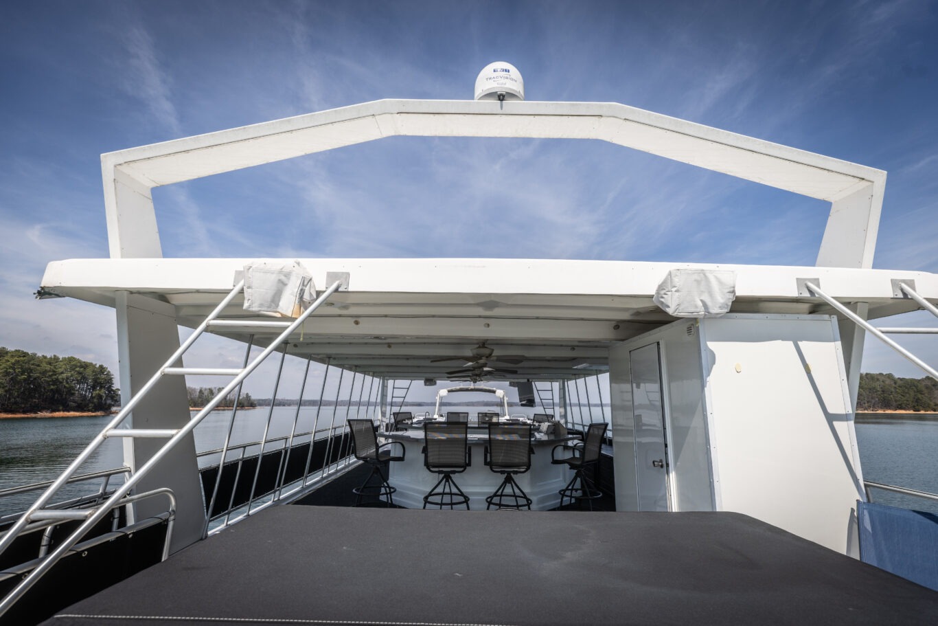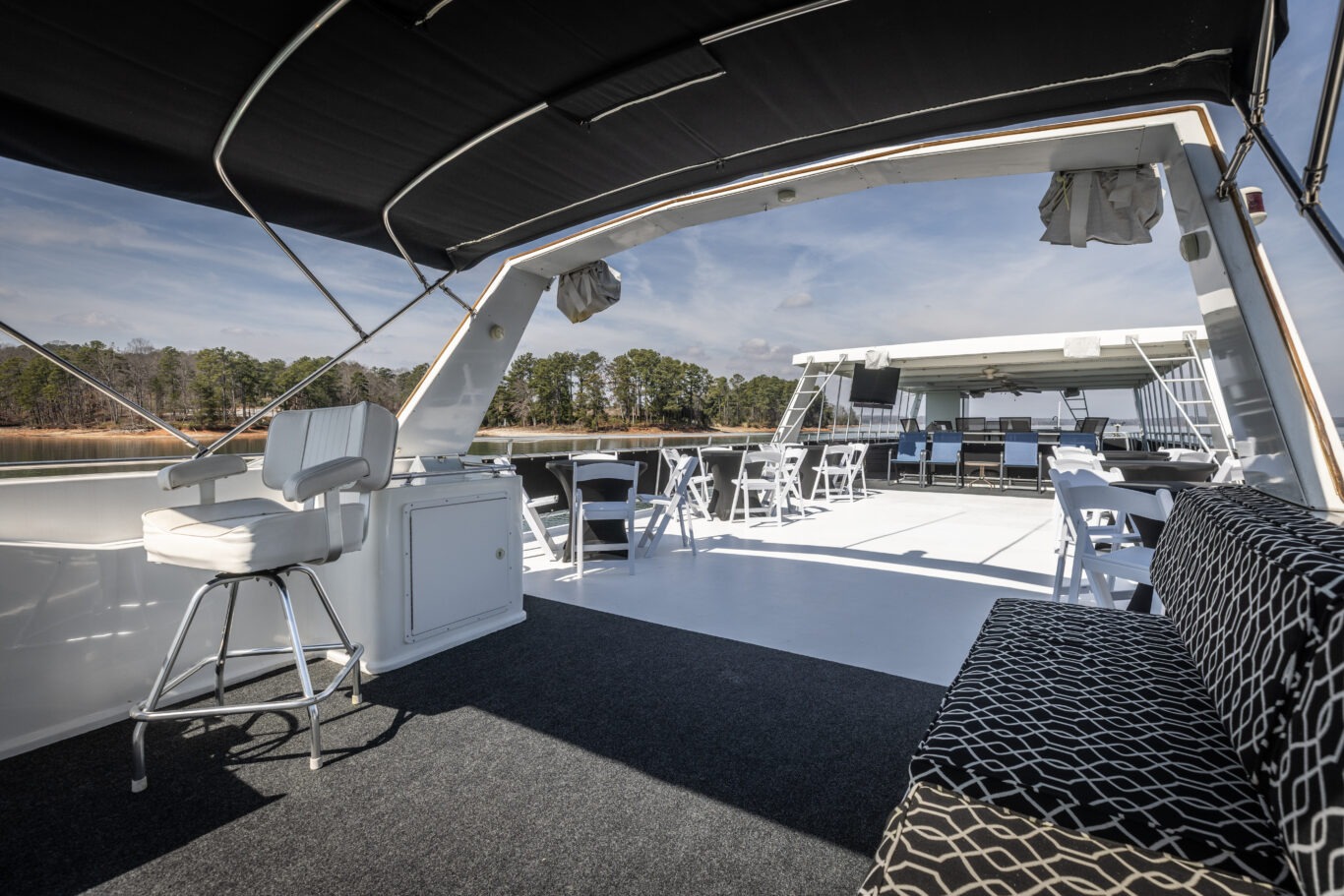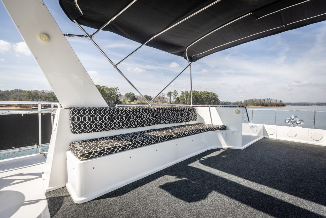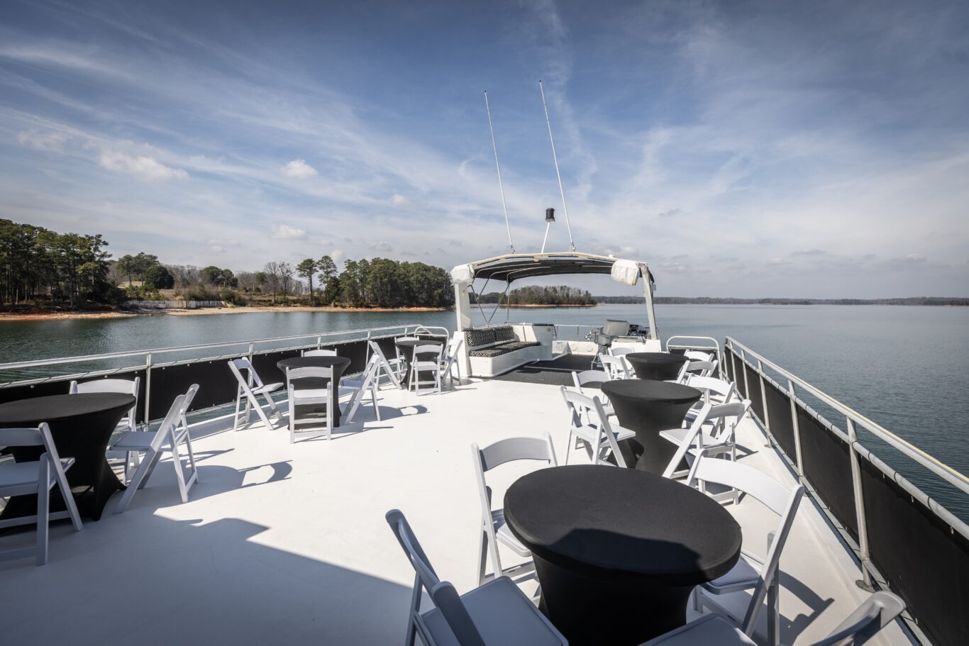 The front deck offers a welcoming outdoor space where guests can relax, socialize, and enjoy the beauty of Lake Lanier. This area provides a calmer setting away from the main entertainment zones, making it perfect for conversation, photos, and soaking in the views during your private cruise.