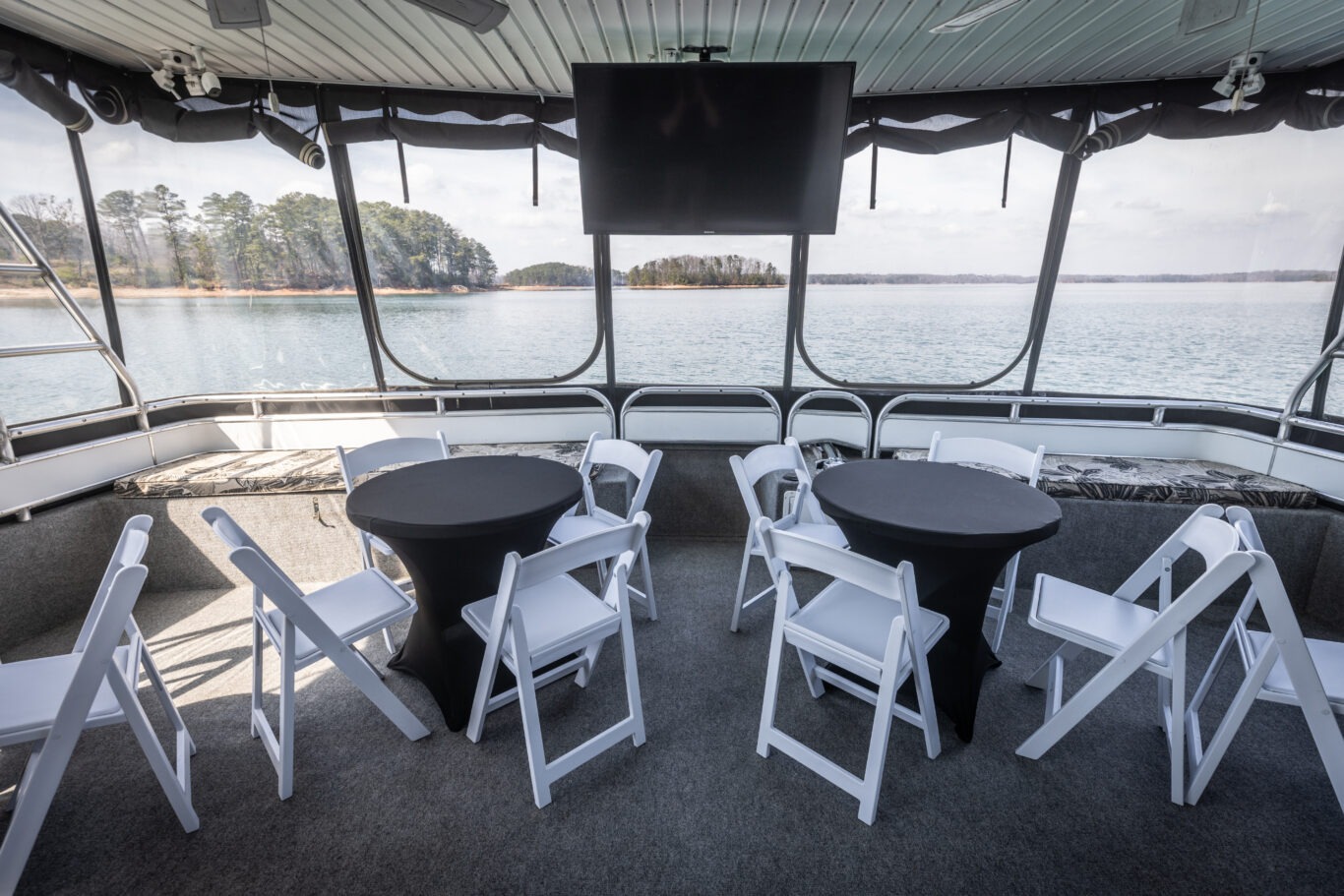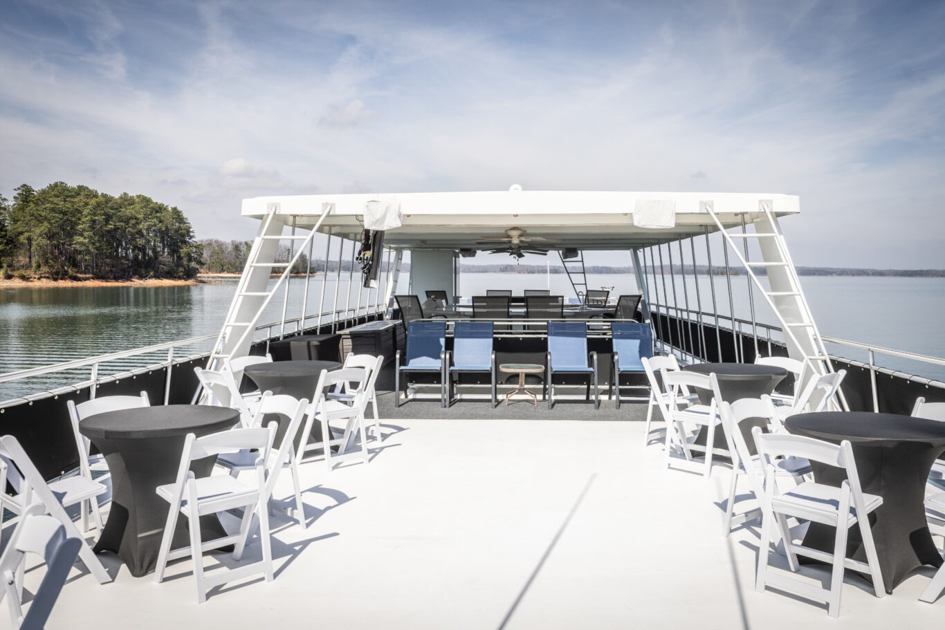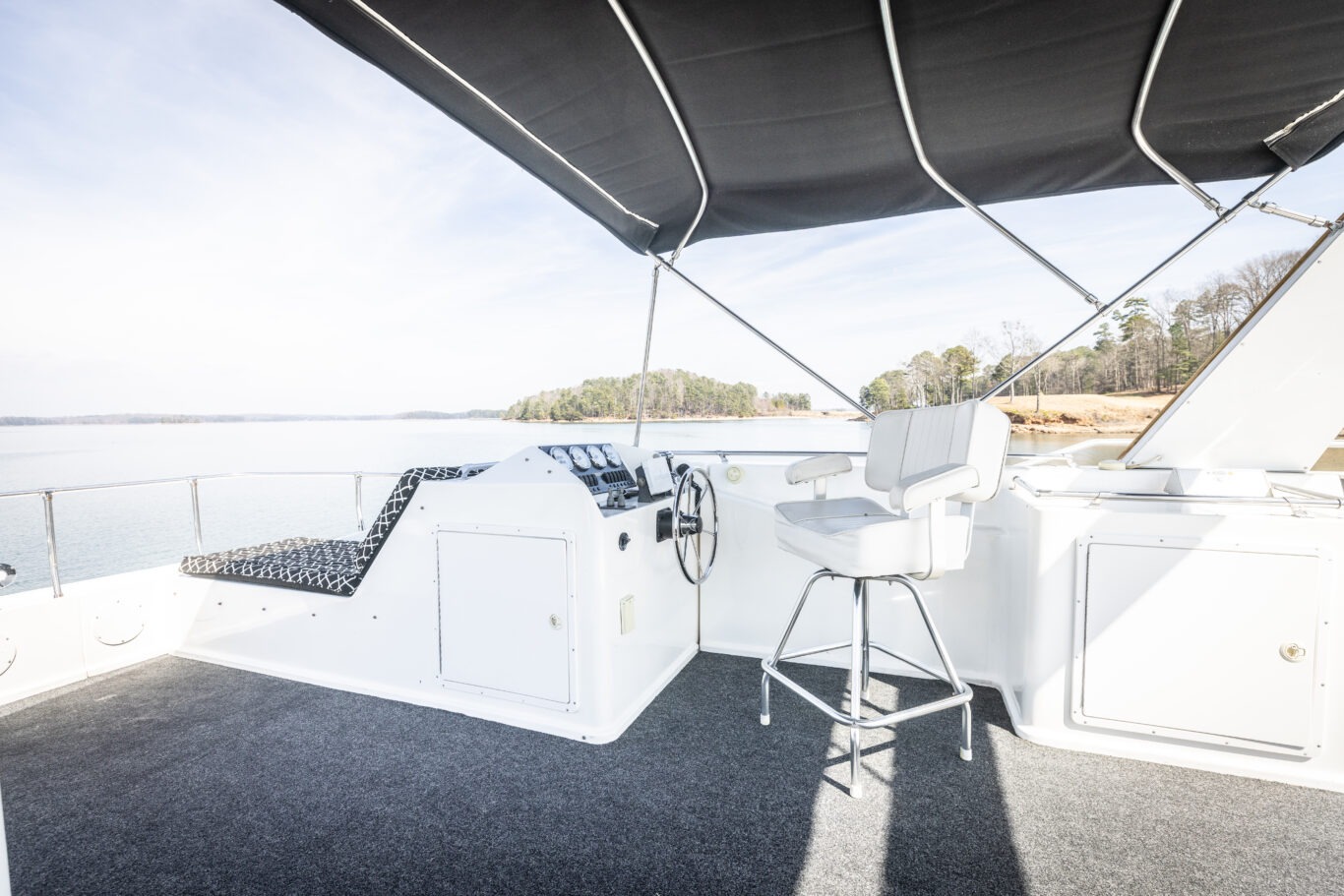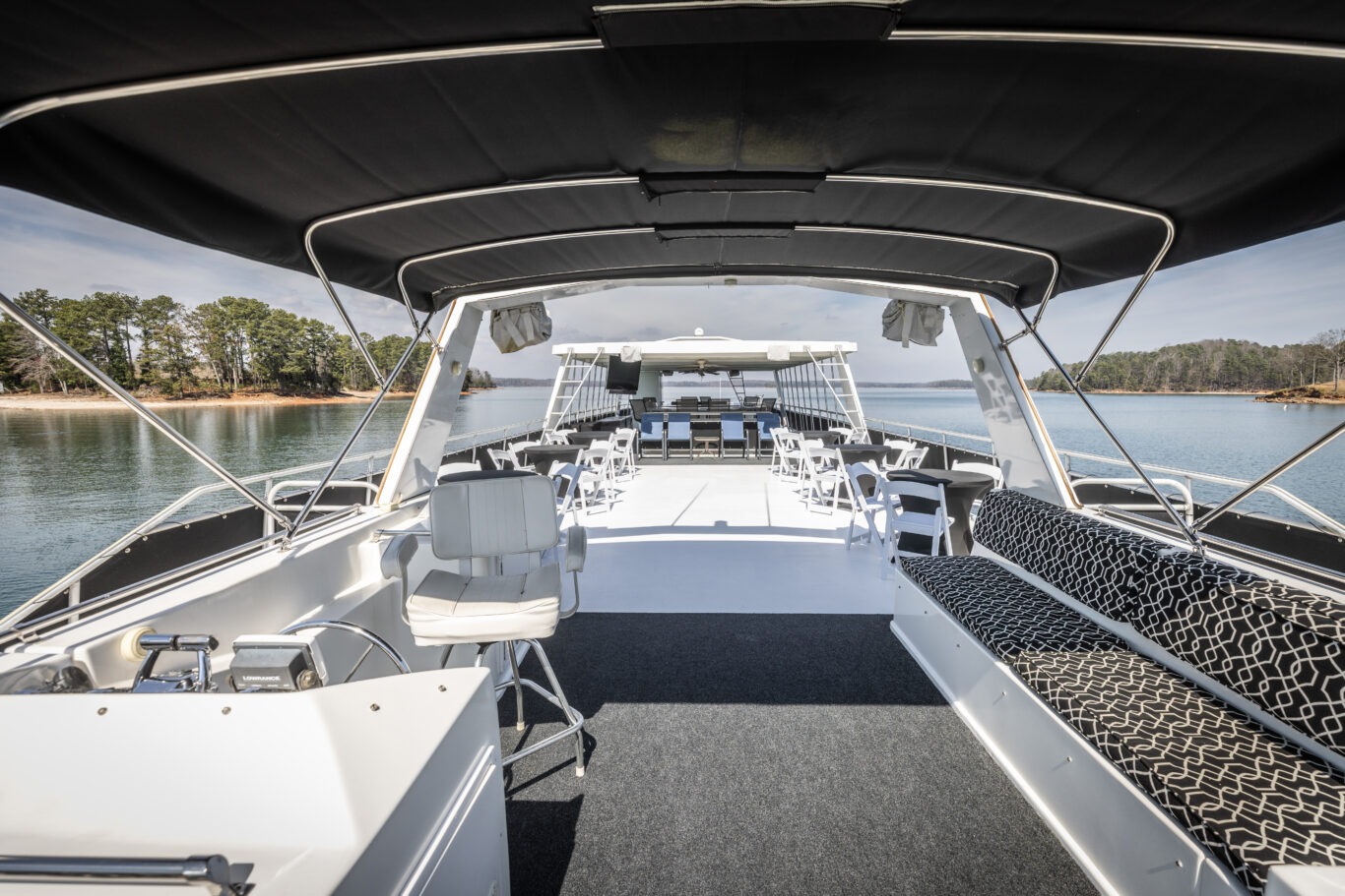 The front deck offers a welcoming outdoor space where guests can relax, socialize, and enjoy the beauty of Lake Lanier. This area provides a calmer setting away from the main entertainment zones, making it perfect for conversation, photos, and soaking in the views during your private cruise.