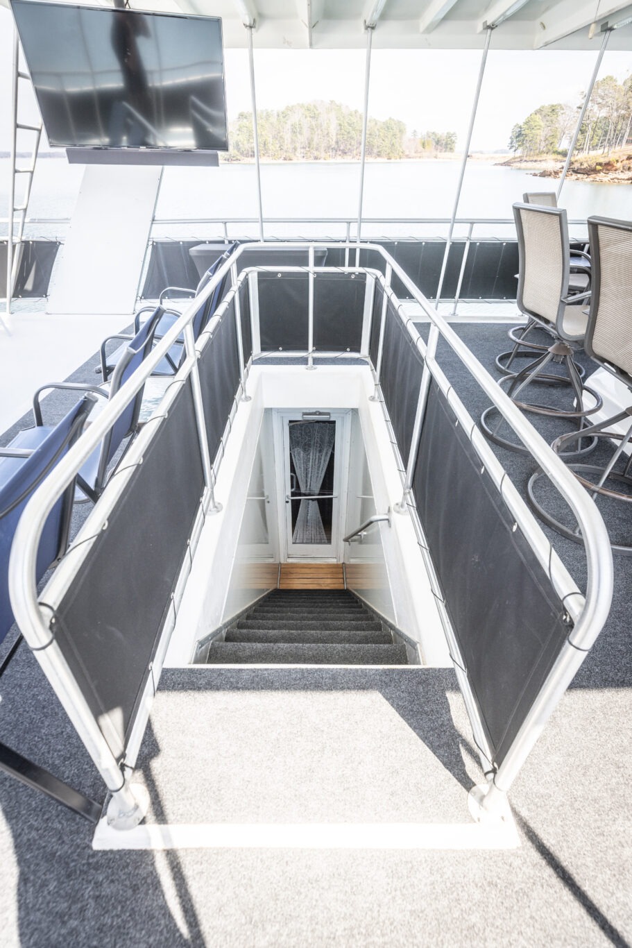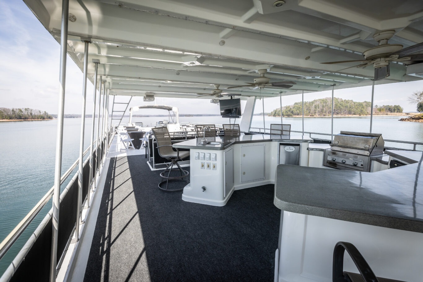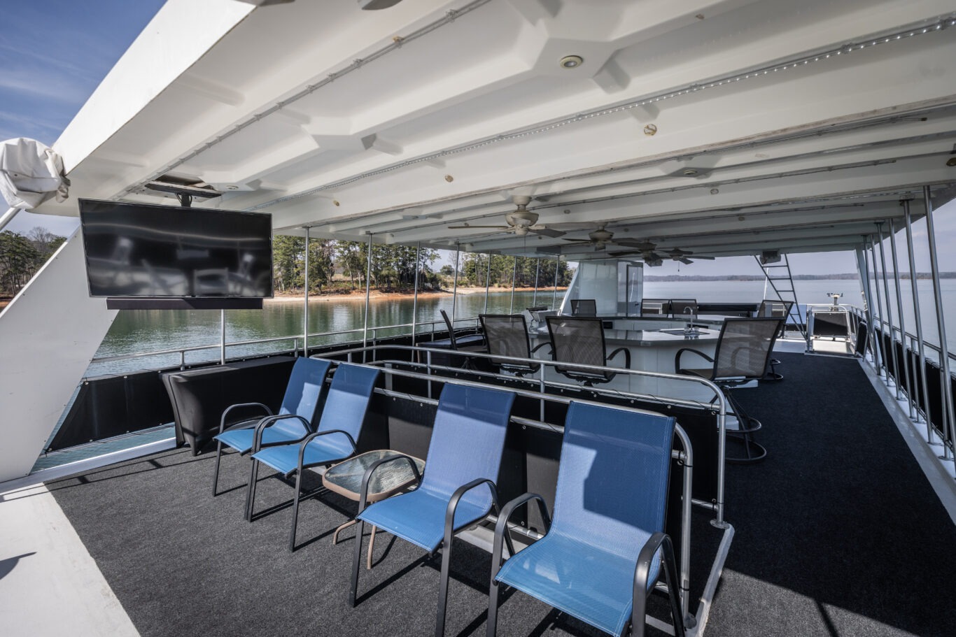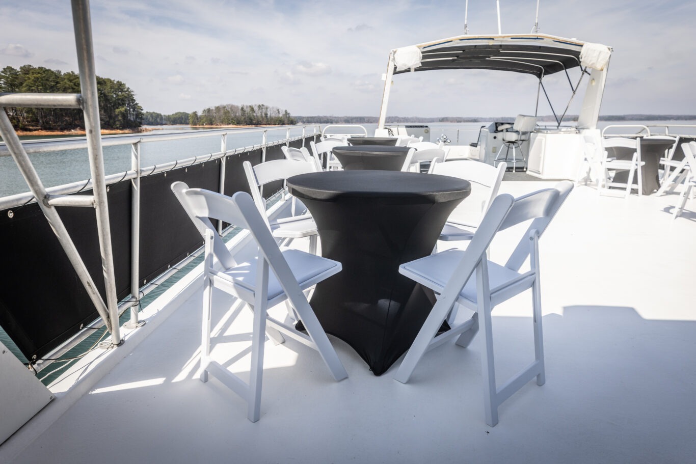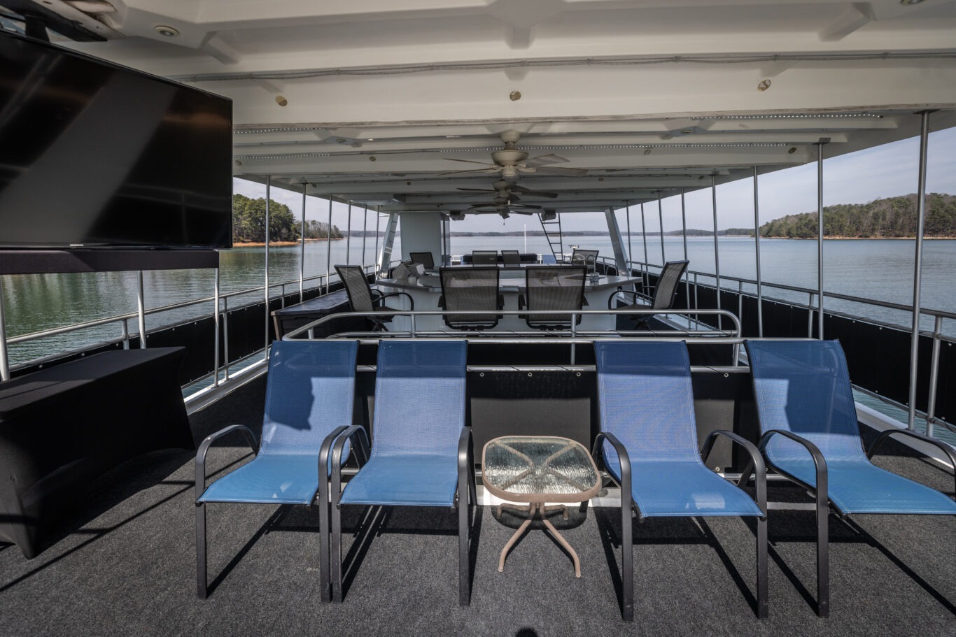 The front deck offers a welcoming outdoor space where guests can relax, socialize, and enjoy the beauty of Lake Lanier. This area provides a calmer setting away from the main entertainment zones, making it perfect for conversation, photos, and soaking in the views during your private cruise.