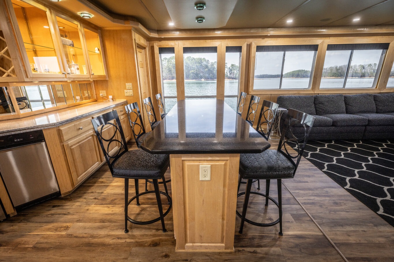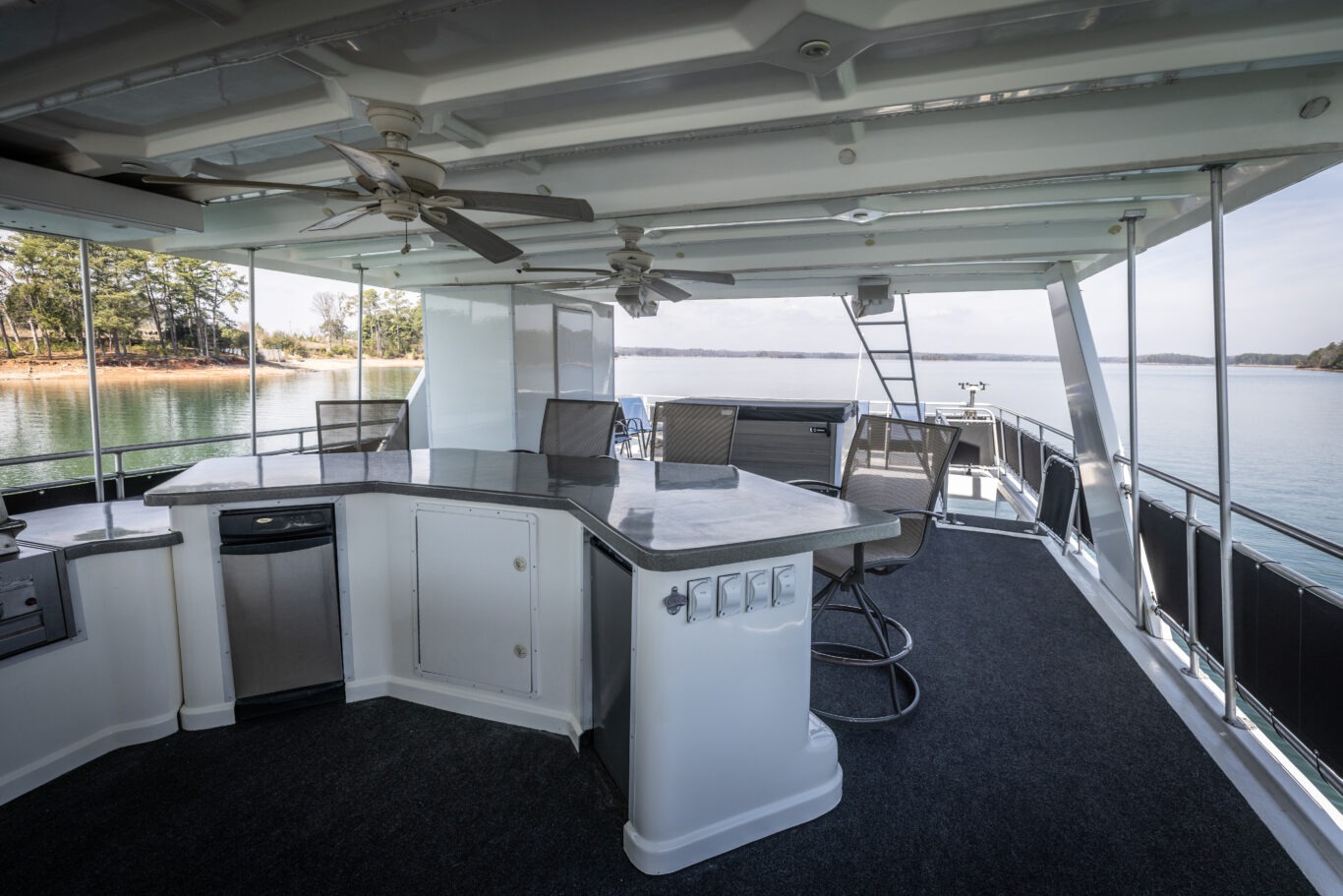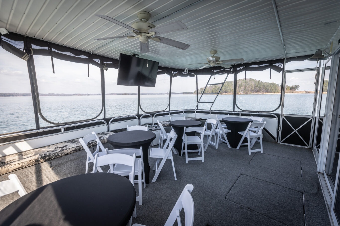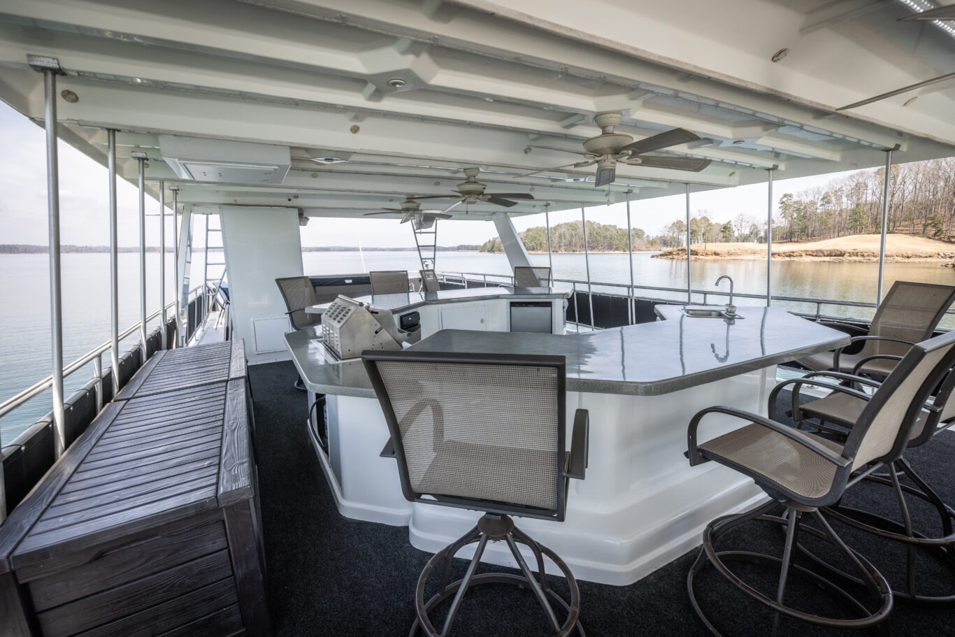 The front deck offers a welcoming outdoor space where guests can relax, socialize, and enjoy the beauty of Lake Lanier. This area provides a calmer setting away from the main entertainment zones, making it perfect for conversation, photos, and soaking in the views during your private cruise.