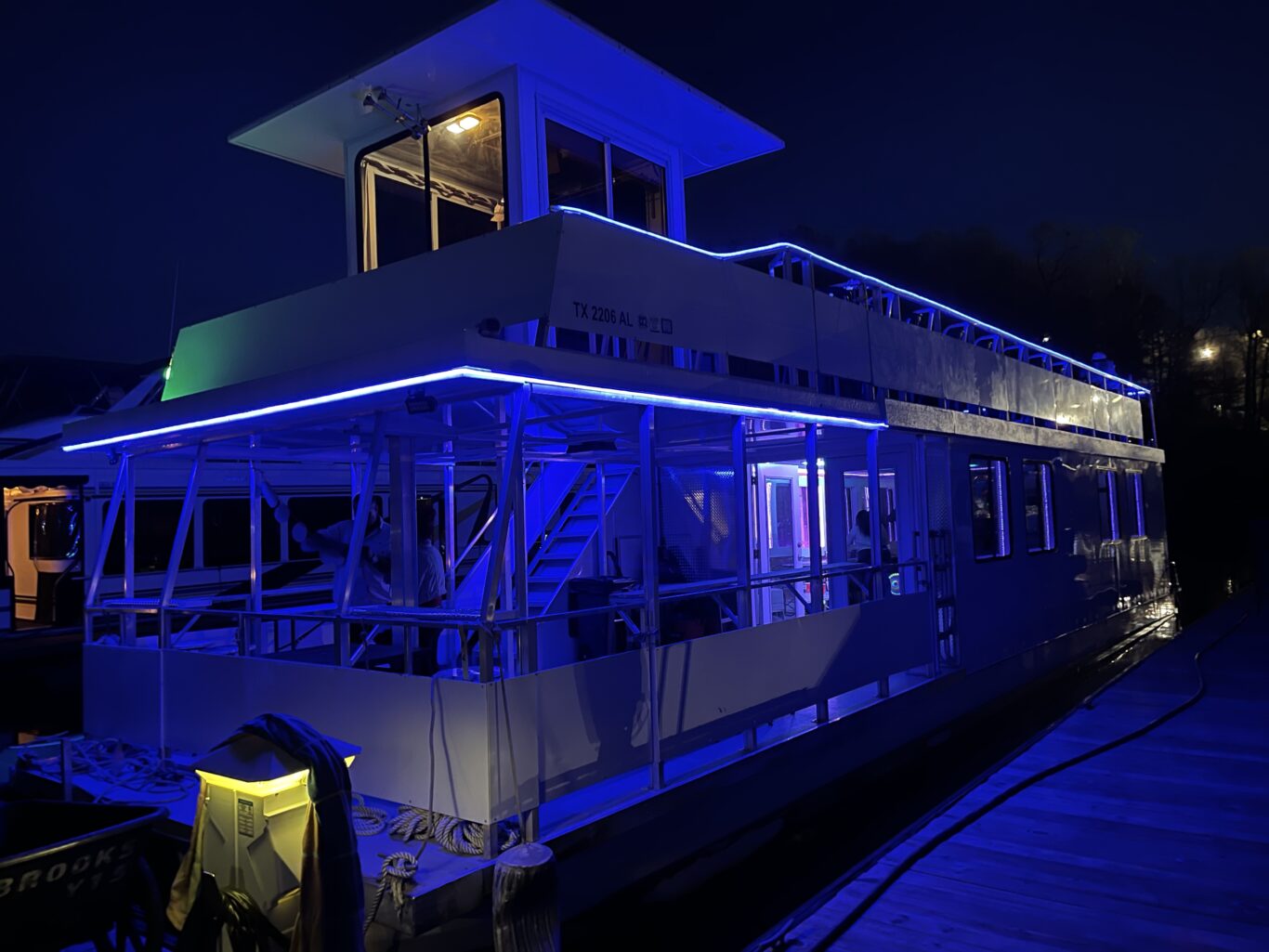 This deck is ideal for daytime enjoyment as well as nighttime celebrations. The LED lighting creates a fun evening atmosphere, making the upper deck feel lively, modern, and welcoming after the sun goes down. Whether your group wants to dance, relax, take in the view, or enjoy music and conversation, this level gives everyone room to enjoy the experience their own way.