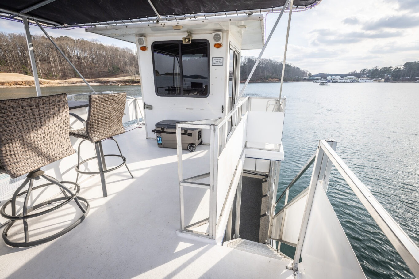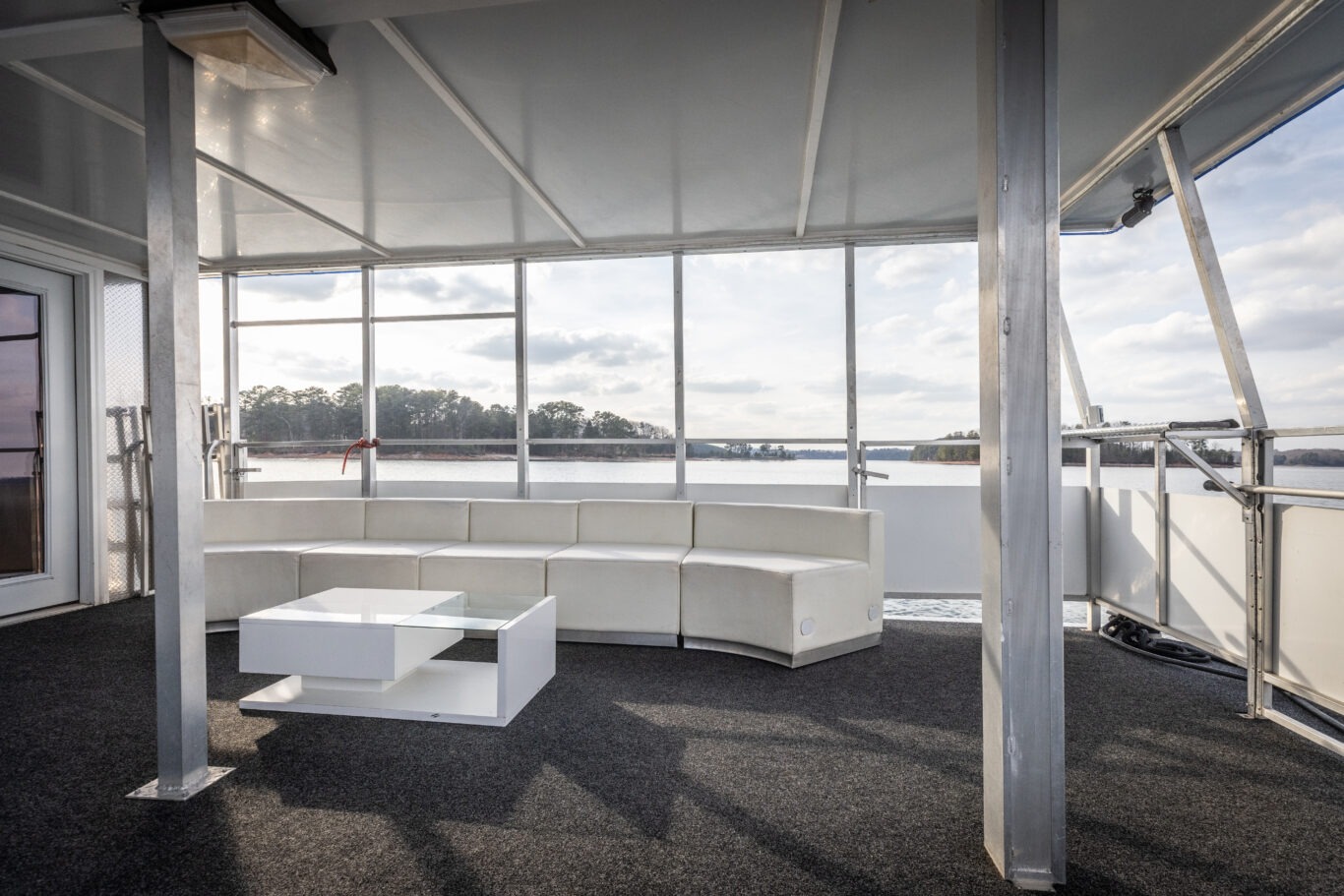 As you step onto The Little Luxury Houseboat, the front deck immediately creates a sense of relaxation and enjoyment. This inviting front porch area gives your group plenty of room to gather, take in the scenery, enjoy conversation, and settle into the experience as your private cruise begins.