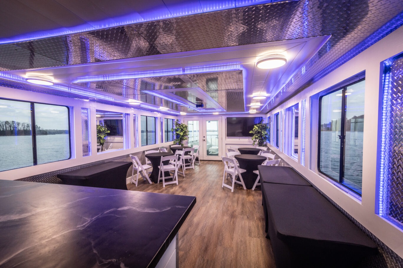 The next step onboard brings you into the spacious interior main room, a flexible venue-style area that is perfect for both celebration and relaxation. This indoor space offers comfortable seating, serving tables for a buffet-style setup, and a downstairs bar area that helps create an easy, functional flow for food, drinks, and conversation.