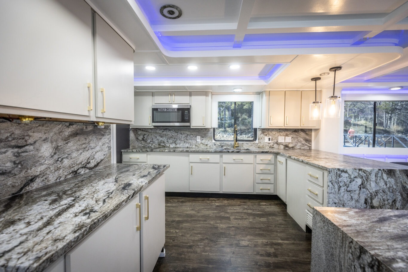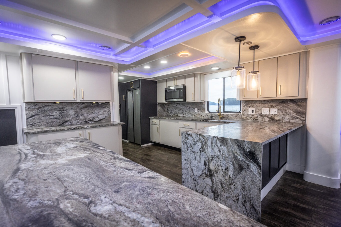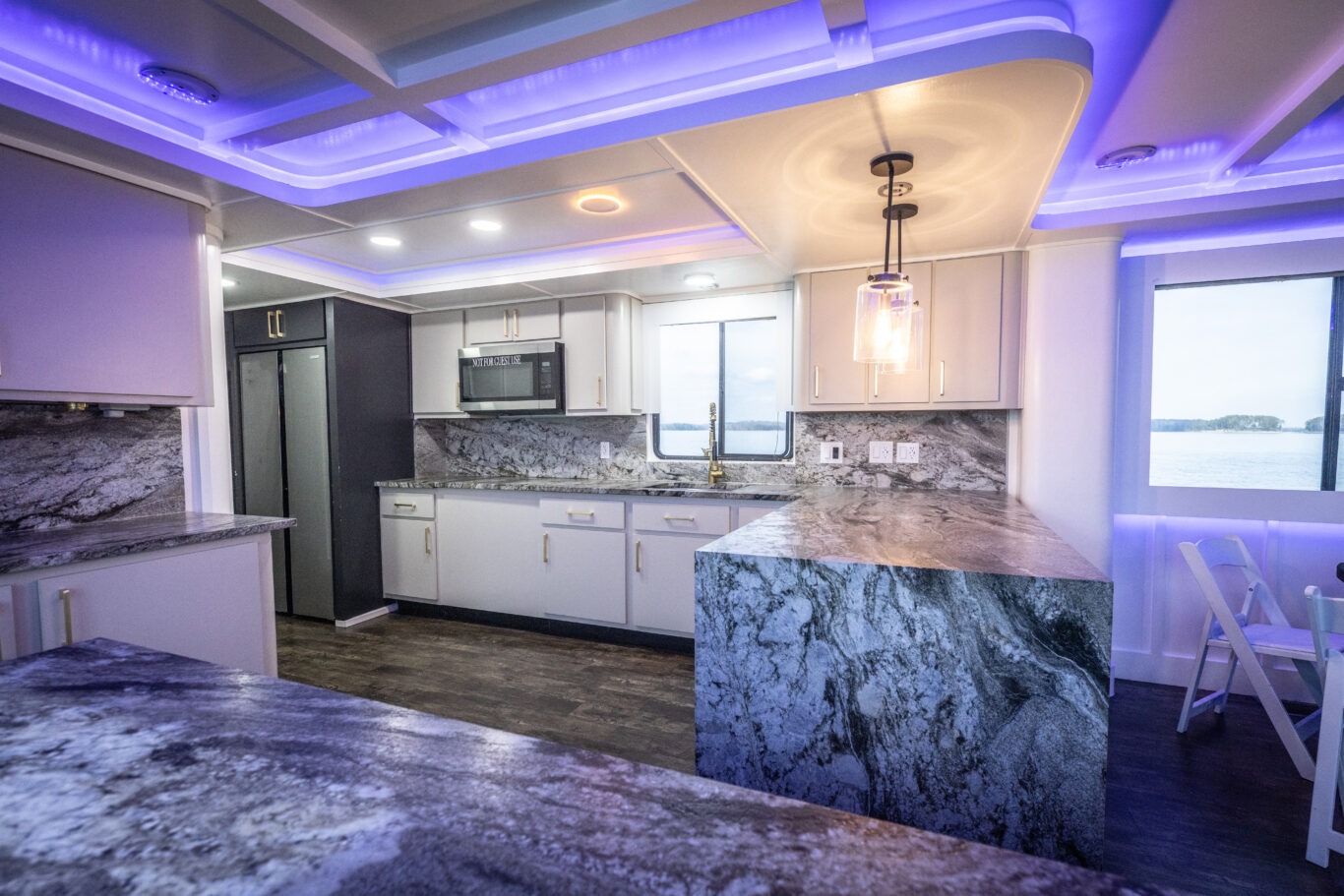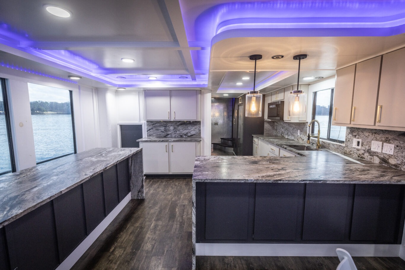 Stepping into the main interior salon, guests immediately experience the upscale elegance of The Stardust Luxury Houseboat.