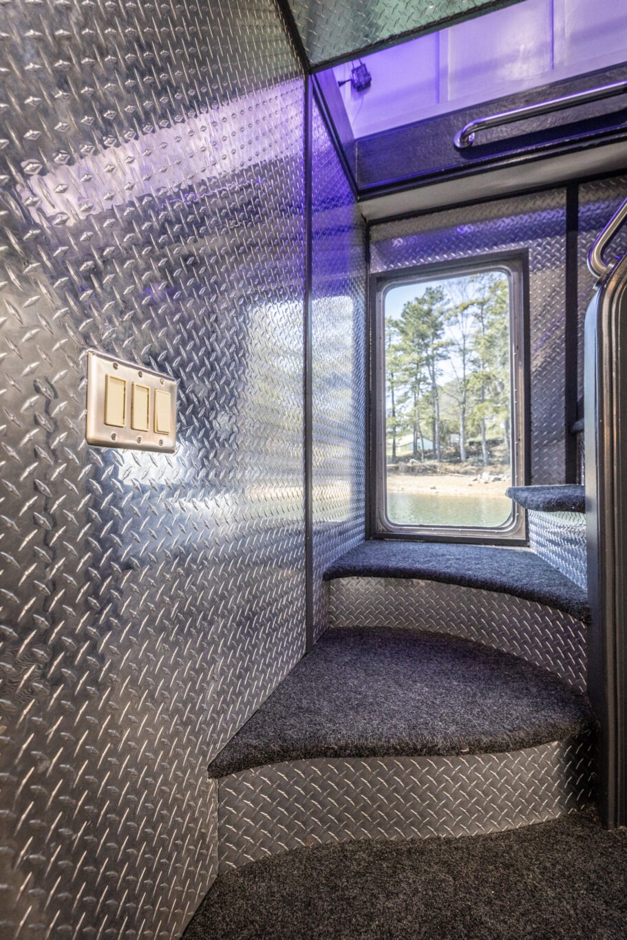 As guests step aboard The Stardust Luxury Houseboat, they are welcomed onto a beautifully enclosed front deck seating area designed for relaxation, conversation, and breathtaking panoramic views of Lake Lanier.
