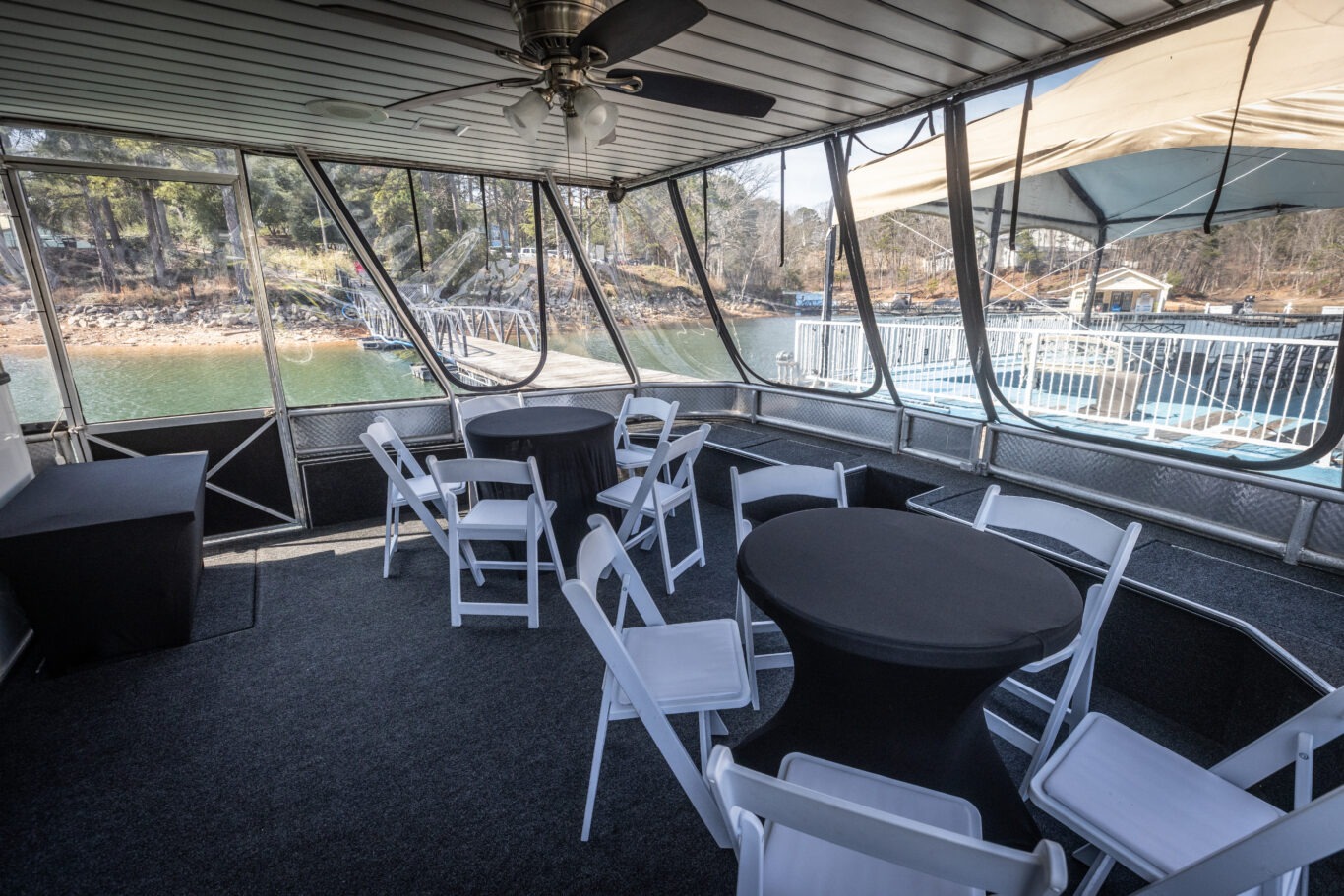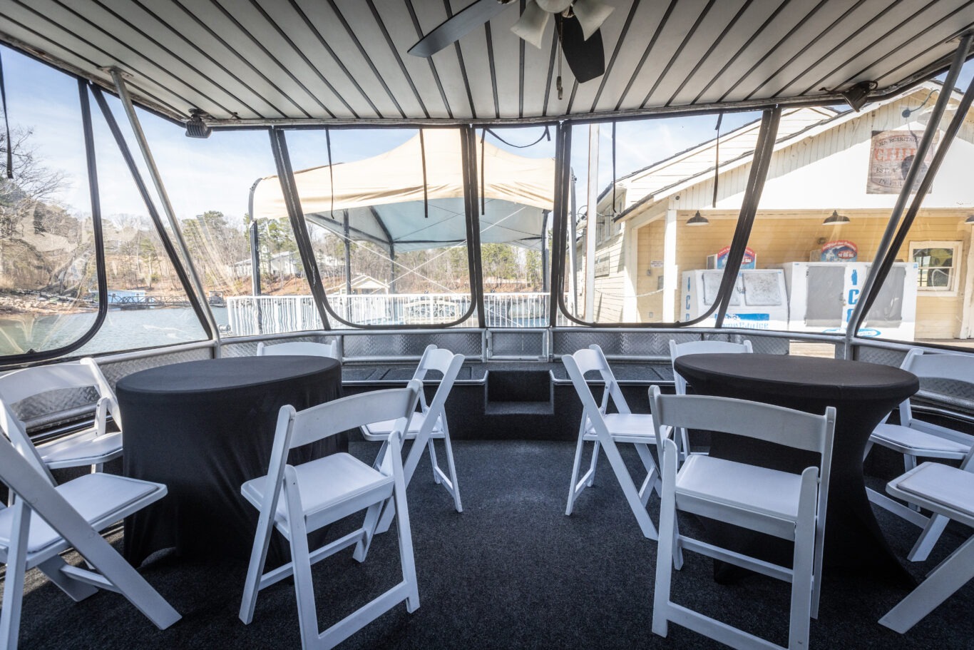 When the weather is perfect, the windows can open to allow guests to enjoy the natural beauty of Lake Lanier. When temperatures drop or weather changes, the enclosure ensures everyone remains comfortable and protected.