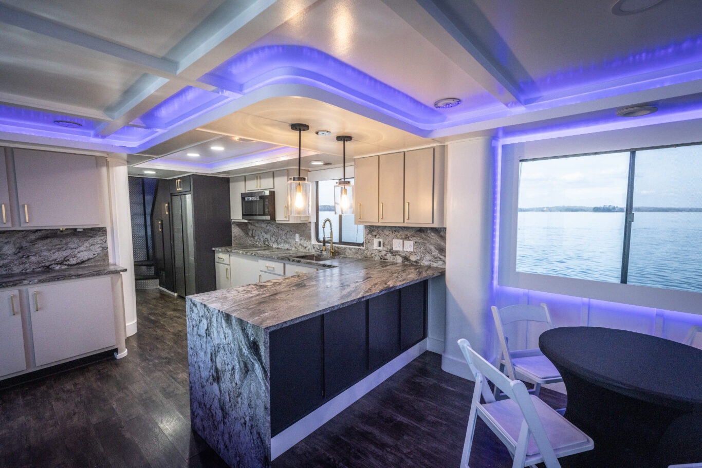 Rain or shine, warm summer evenings or crisp winter nights, The Stardust Luxury Houseboat is ready to cruise year-round. The upper entertainment level is fully enclosed with commercial heating and air-conditioning, allowing guests to enjoy incredible lake views and luxury entertainment regardless of the season.